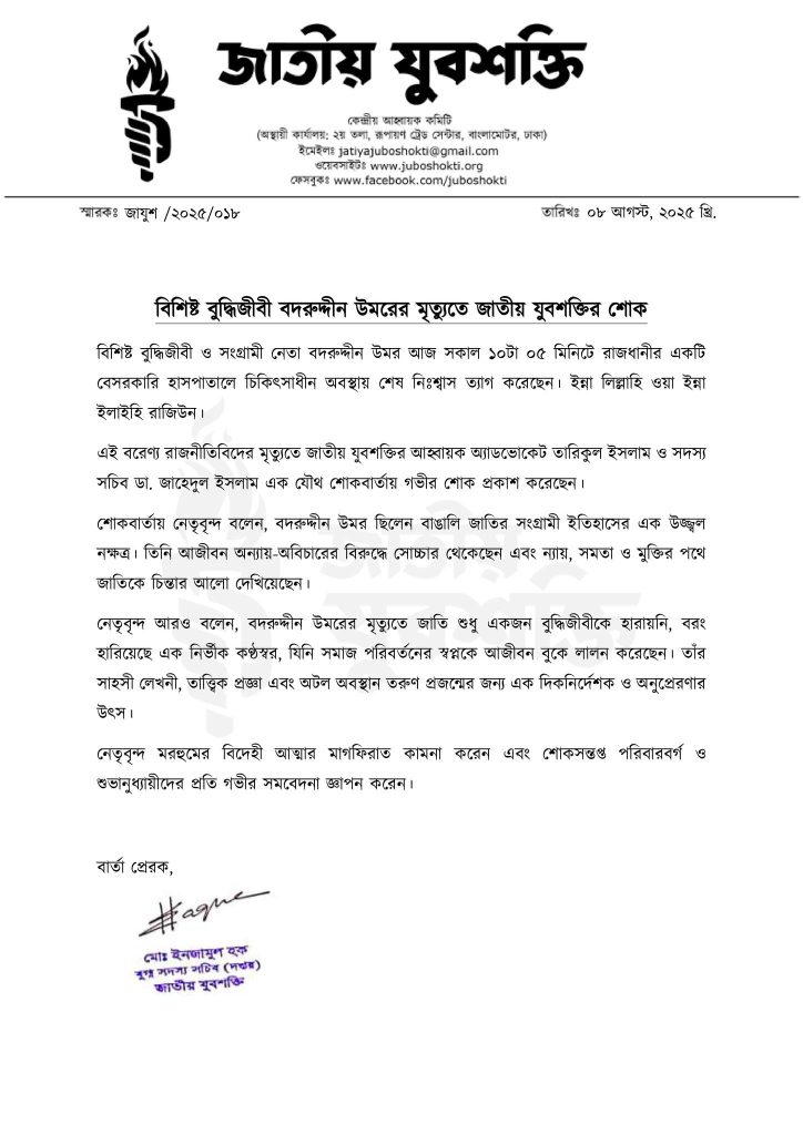 বিশিষ্ট বুদ্ধিজীবী বদরুদ্দীন উমরের মৃত্যুতে জাতীয় যুবশক্তির শোক